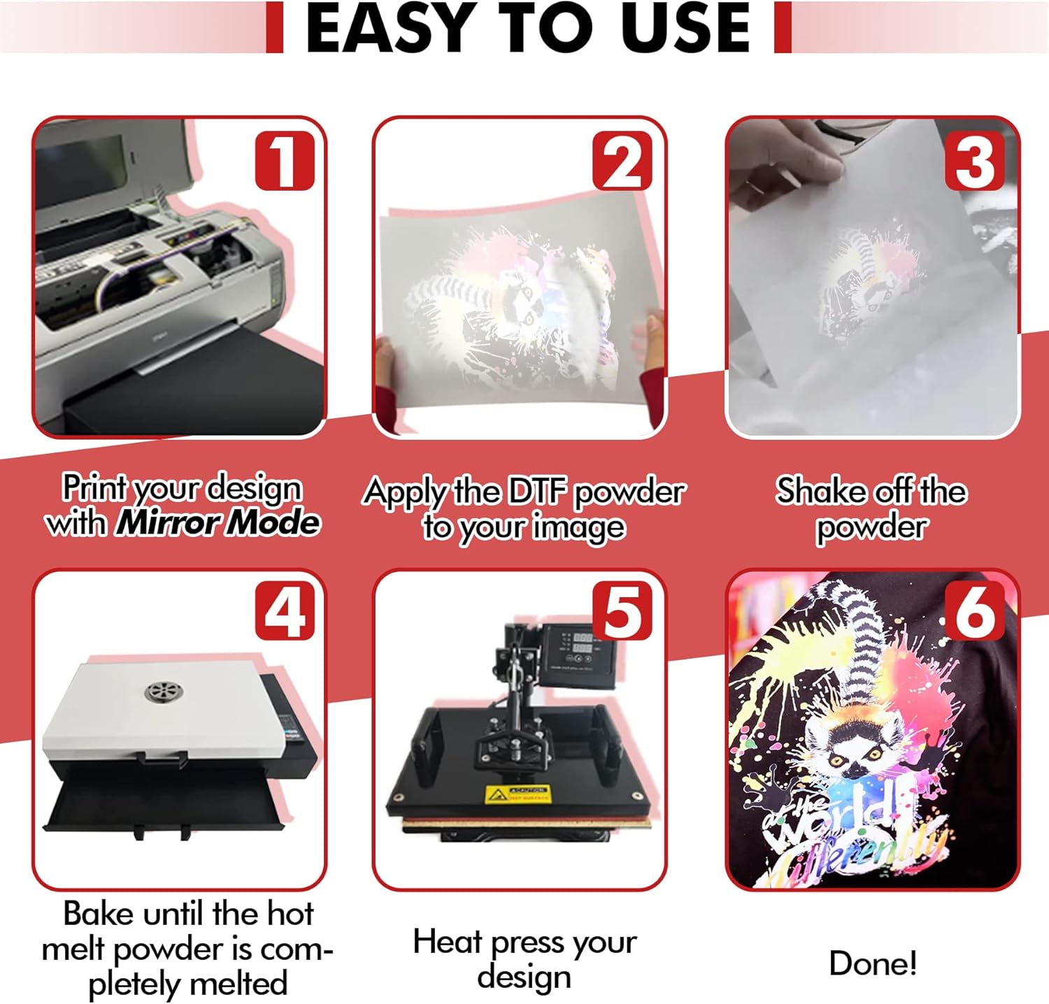 Careful: When handling DTF hot melt powder, do not ingest or inhale the powder or vapors. Harmful if swallowed. May cause skin irritation. Avoid contact with skin and eyes. If eye contact occurs, rinse thoroughly with water. Wear clothing, protective equipment, mask, and gloves when handling powder. If allergic reaction persists or if accidentally swallowed, seek immediate medical attention.