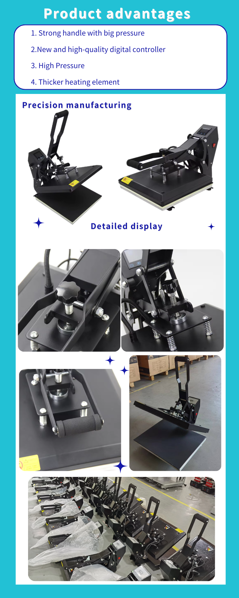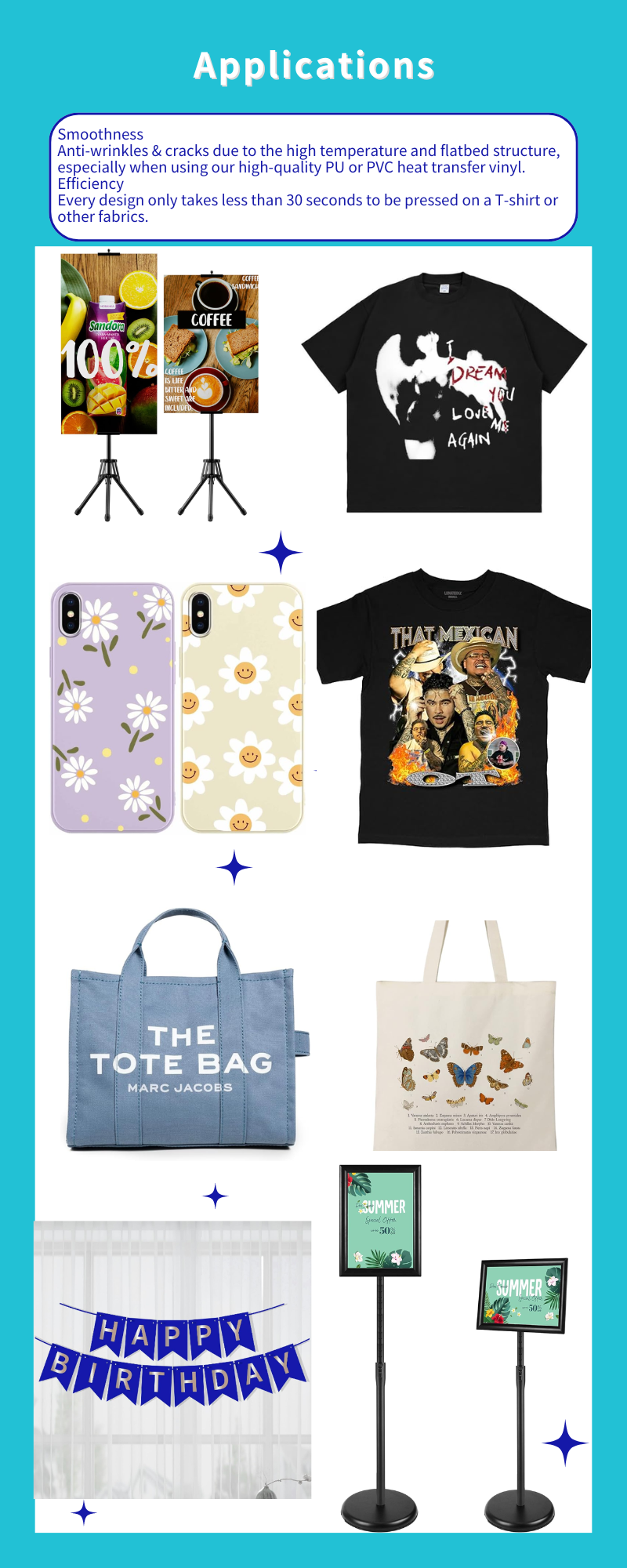 Anti-wrinkles & cracks due to the high temperature and flatbed structure, especially when using our high-quality PU or PVC heat transfer vinyl.
